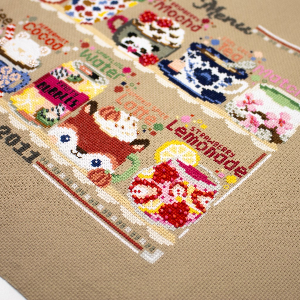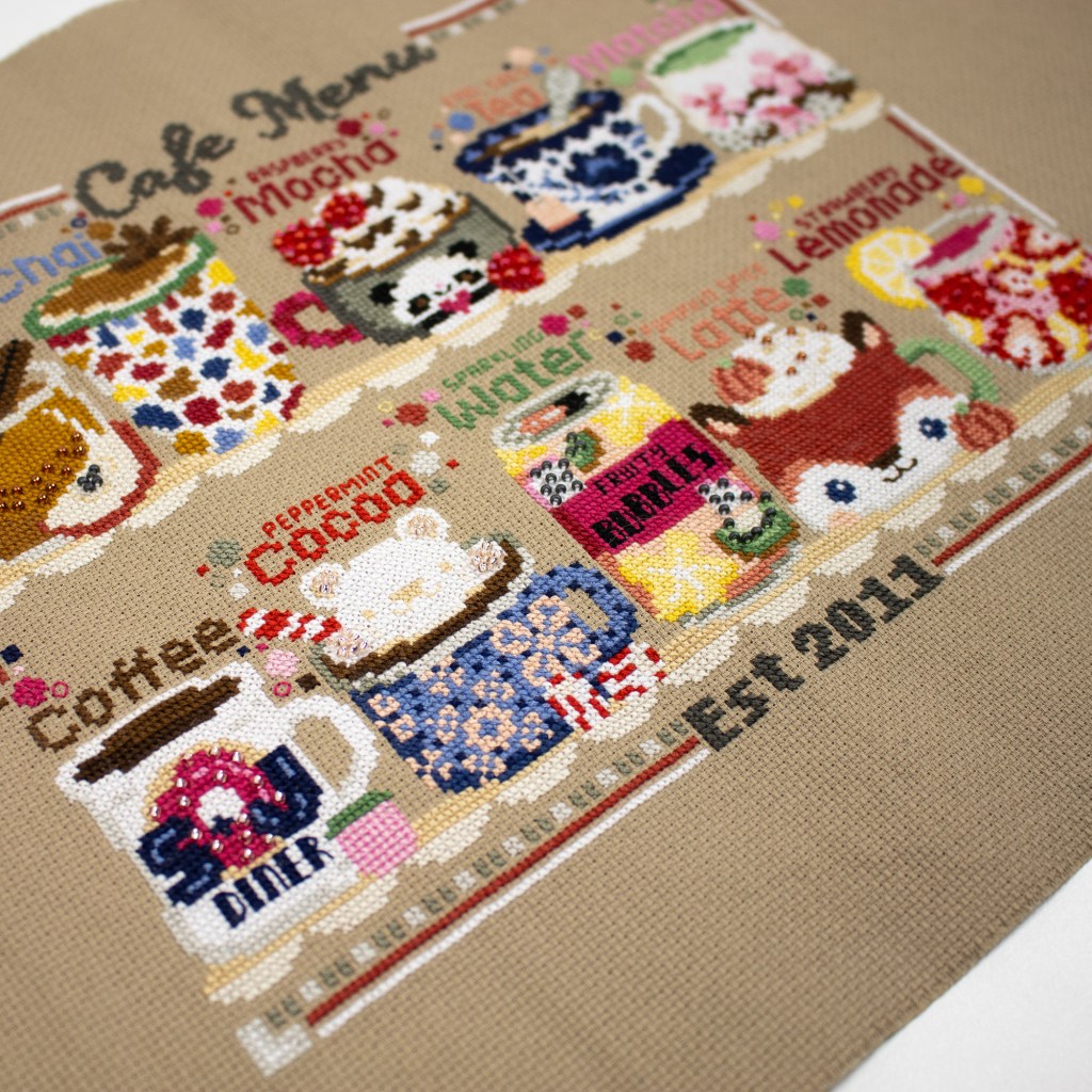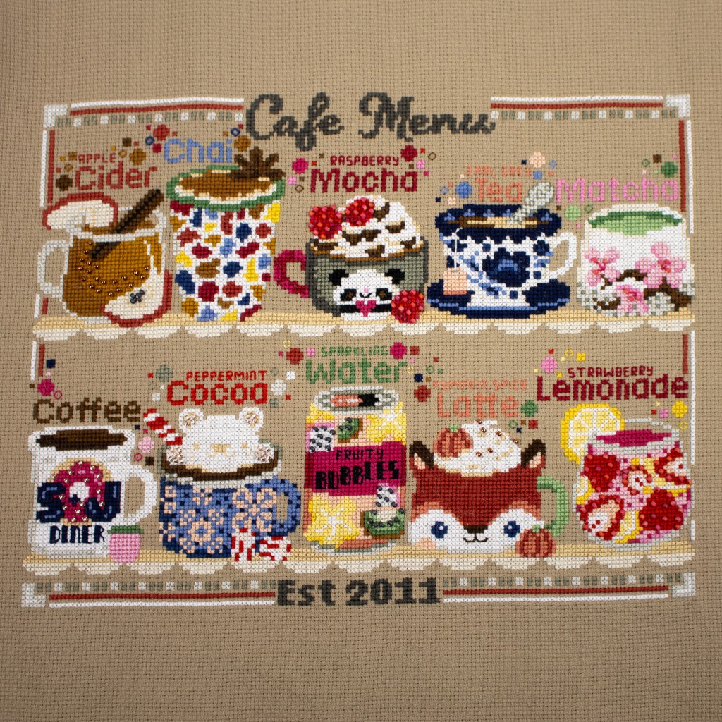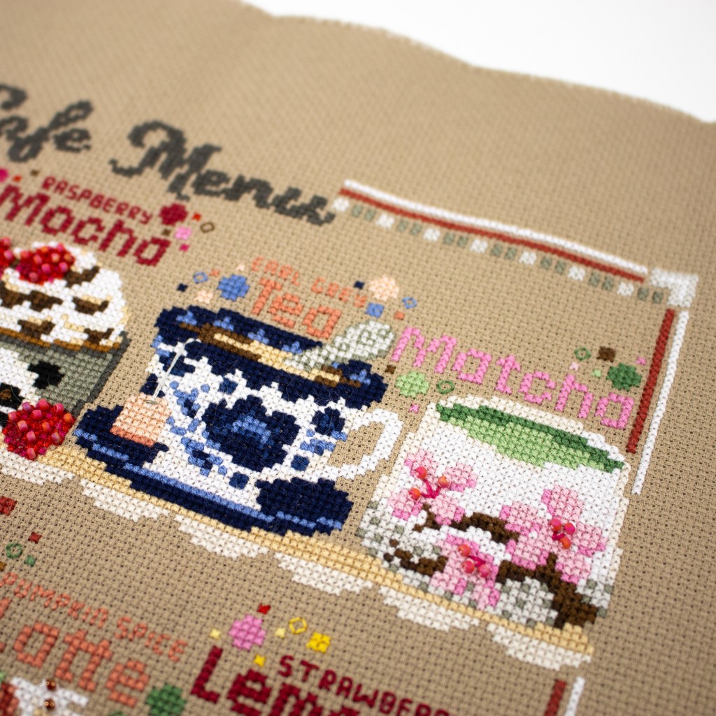 As an avid coffee drinker I’m always on the hunt for fun coffee related patterns that I can stitch and add to my cozy coffee nook. When I found the cute Cozy Cafe Pattern I knew I wanted to stitch it for my walls. It was super fun to stitch, I did make some changes so it did come out a bit different compared to the original.